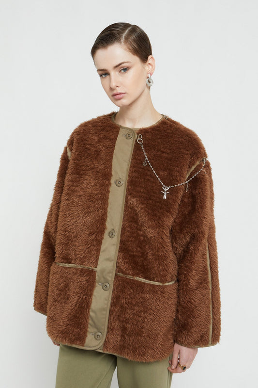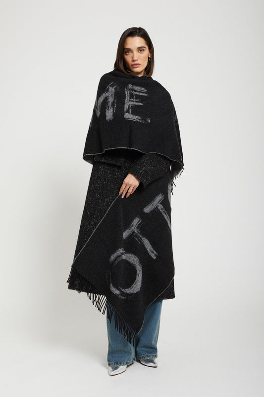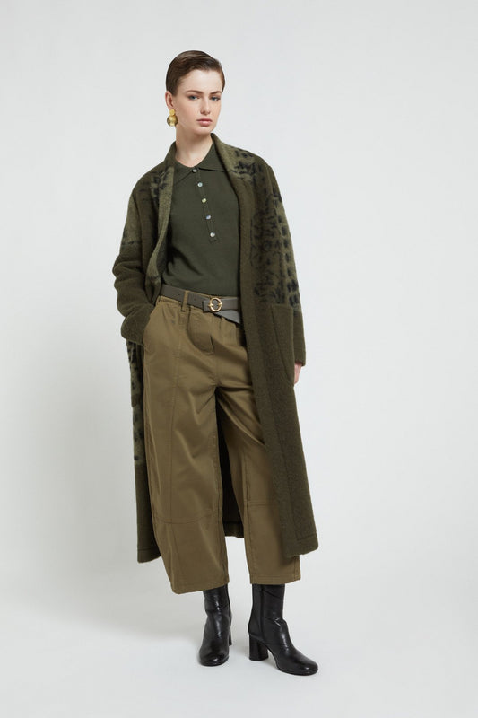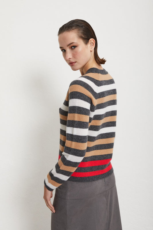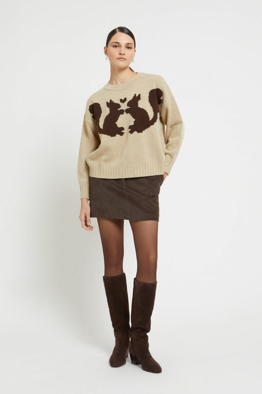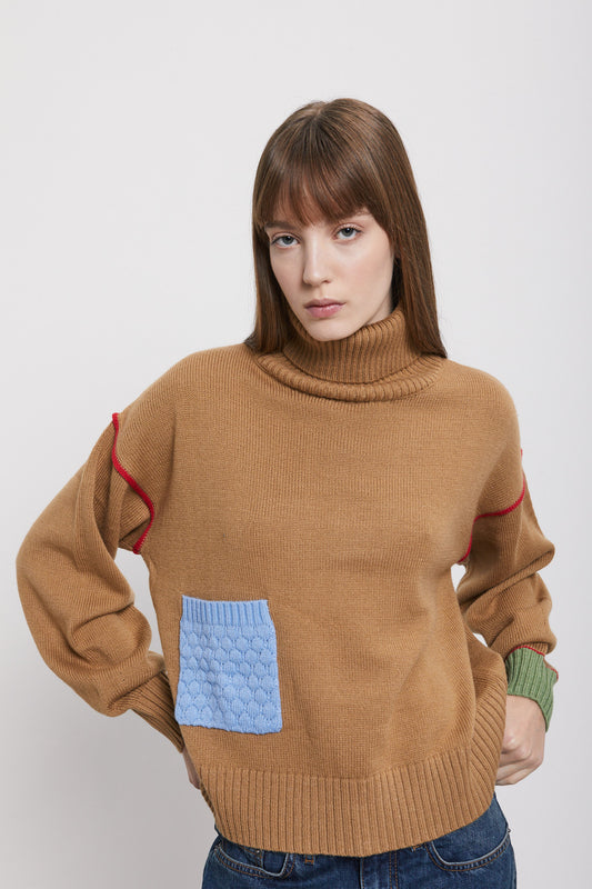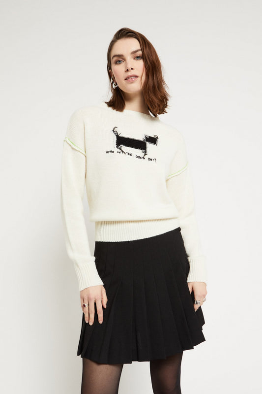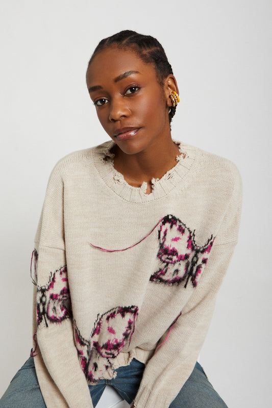 Wool blend sweater with raw edges,intarsia,and embroidery