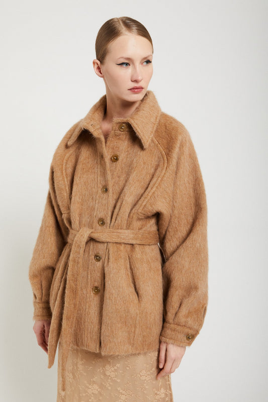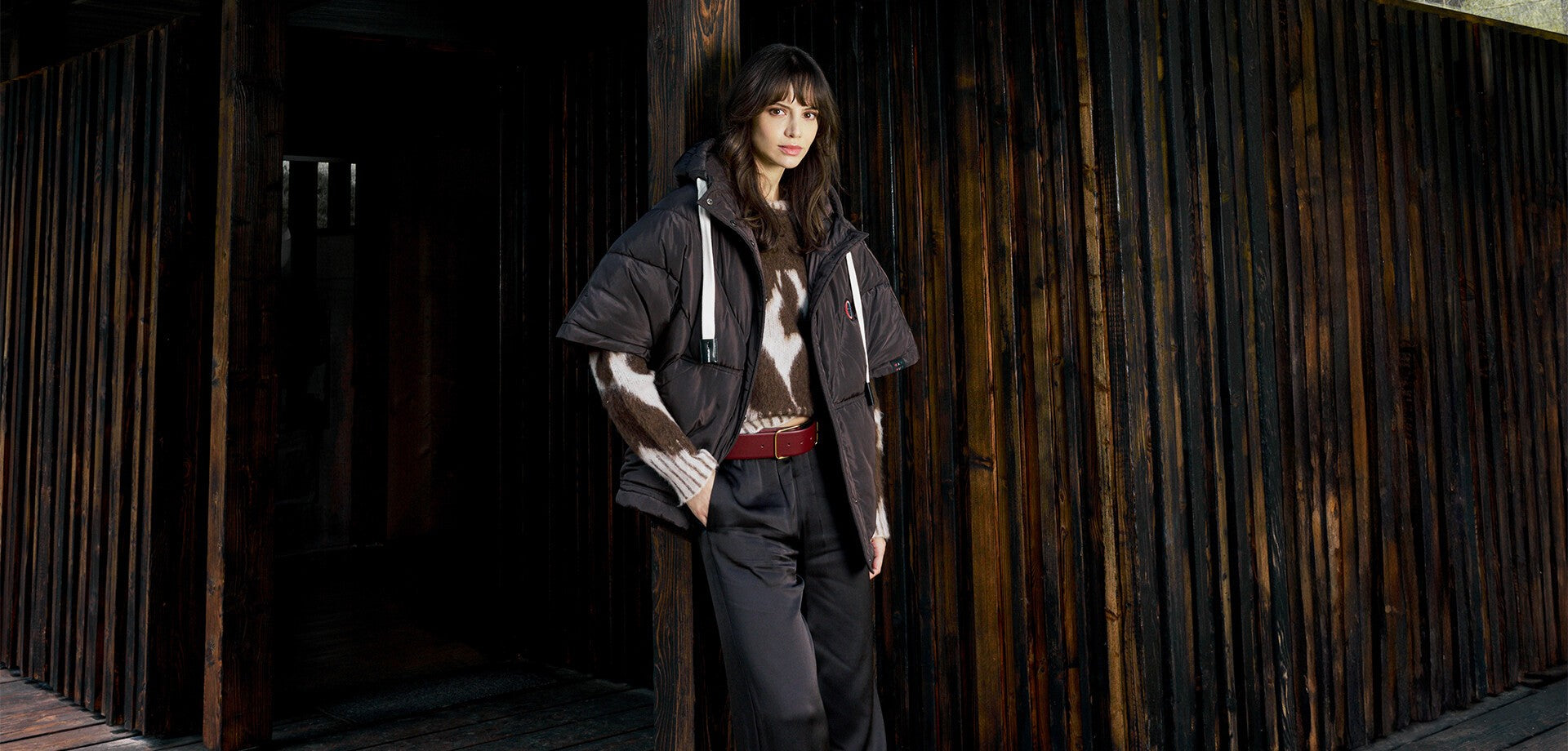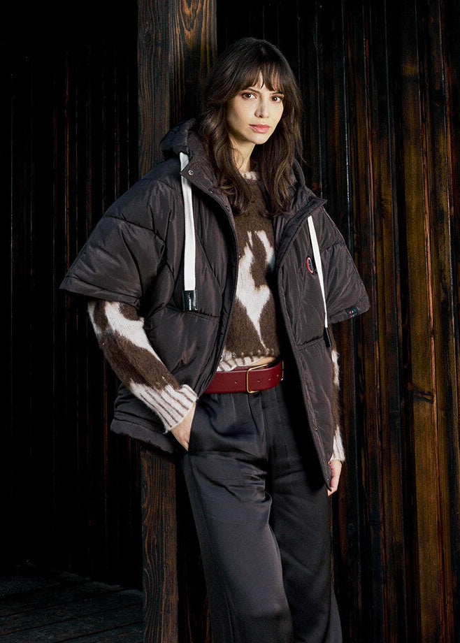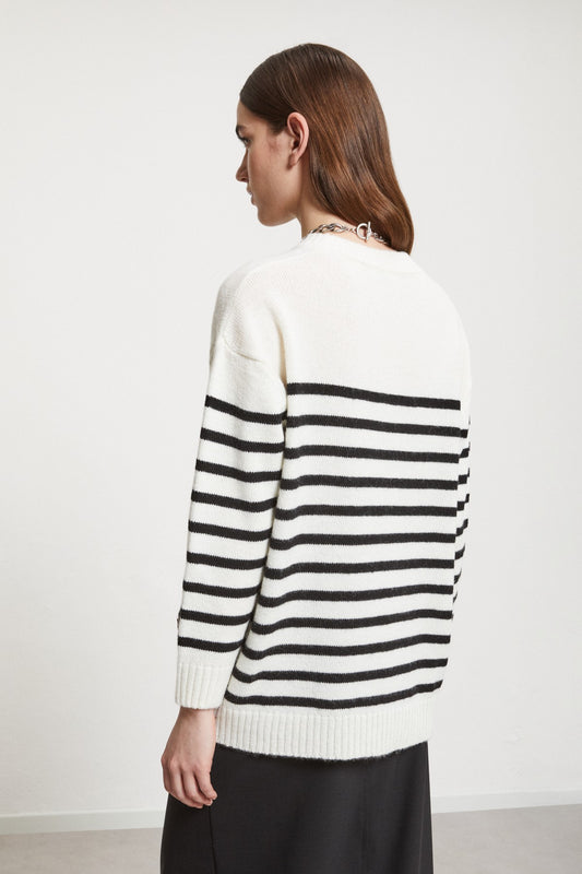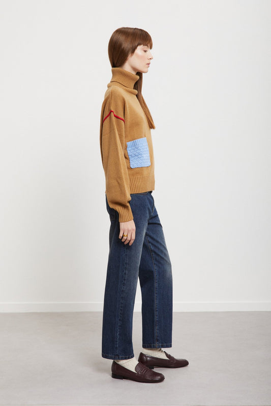 Wool blend sweater with raw edges,intarsia,and embroidery